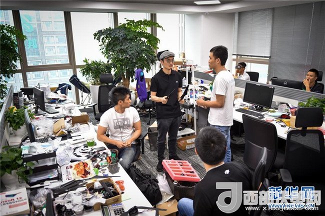 在深圳科技園的大疆創(chuàng)新總部,民用無人機領軍者汪滔(中)參與研發(fā)人員的討論(2015年5月22日攝)。新華社記者毛思倩攝
