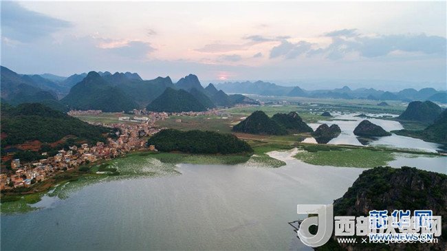 這是5月26日無人機(jī)拍攝的普者黑國家濕地公園日落一景。