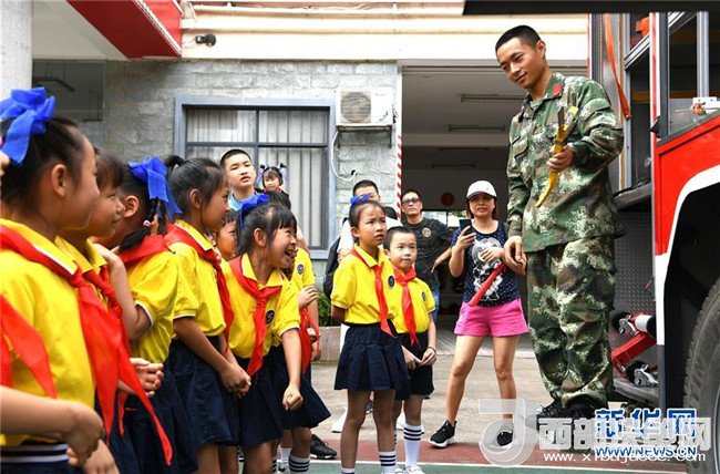 6月2日,孩子們和家長(zhǎng)在廣西南寧市青秀區(qū)公安消防大隊(duì)柳沙中隊(duì)參觀消防車,了解消防設(shè)備使用方法。