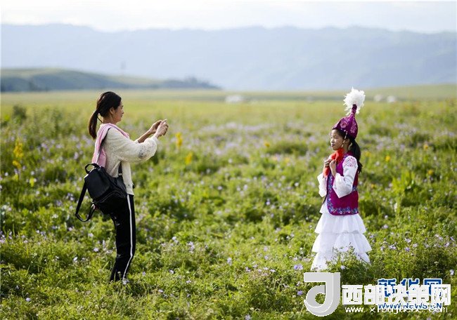 游客在那拉提“空中草原”拍照留影(7月8日攝)。
