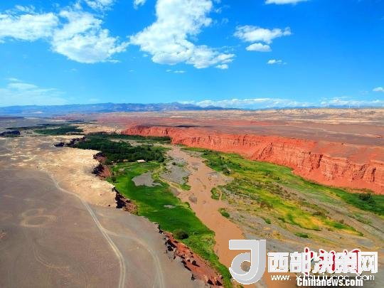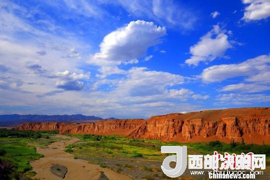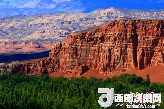 站在天山紅河谷入口處的斷崖邊,可以清晰地看到遠處的天山,天然的紅土飄帶,一簇簇的綠蔭,坐落有致的農家院落。荒涼的戈壁與斷崖下的美景,給人以強烈的視覺沖擊。紅色的山巖,猶如一條鑲嵌在天際間的飄帶而光彩奪目,河谷內寧靜的村莊透露著幾分神秘。