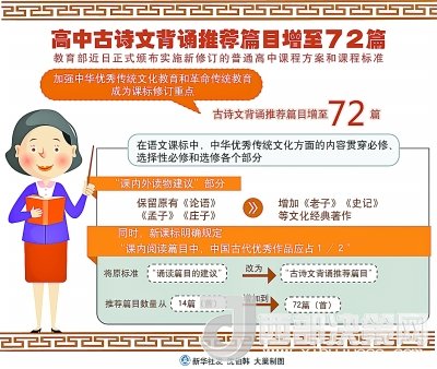 其中,語文課標(biāo)最突出,中華優(yōu)秀傳統(tǒng)文化方面的內(nèi)容貫穿必修、選擇性必修和選修各個(gè)部分。一是內(nèi)容更全,在“課內(nèi)外讀物建議”部分,除保留原有《論語》《孟子》《莊子》外,增加了《老子》《史記》等文化經(jīng)典著作,要求學(xué)生廣泛閱讀各類古詩文,覆蓋先秦到清末各個(gè)時(shí)期。二是分量更多,課程標(biāo)準(zhǔn)明確規(guī)定“課內(nèi)閱讀篇目中,中國(guó)古代優(yōu)秀作品應(yīng)占1/2”。三是要求更高,在全面加強(qiáng)的同時(shí),還設(shè)置中華優(yōu)秀傳統(tǒng)文化學(xué)習(xí)專題,進(jìn)行中華傳統(tǒng)文化經(jīng)典作品深入學(xué)習(xí)研討。將原標(biāo)準(zhǔn)“誦讀篇目的建議”改為“古詩文背誦推薦篇目”,推薦篇目數(shù)量也從14篇(首)增加到72篇(首),提高了學(xué)習(xí)要求。