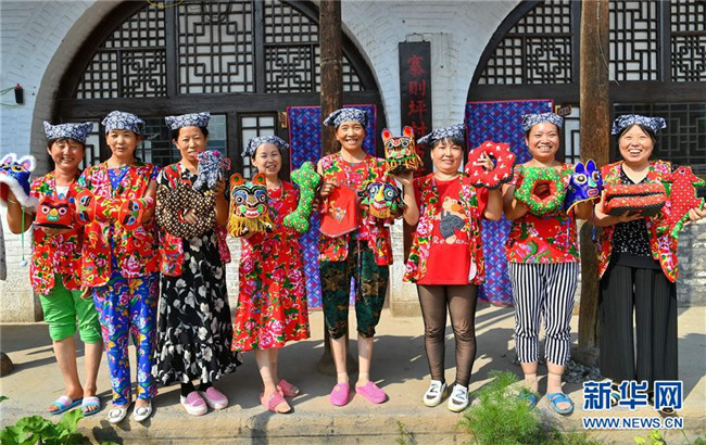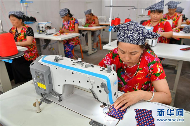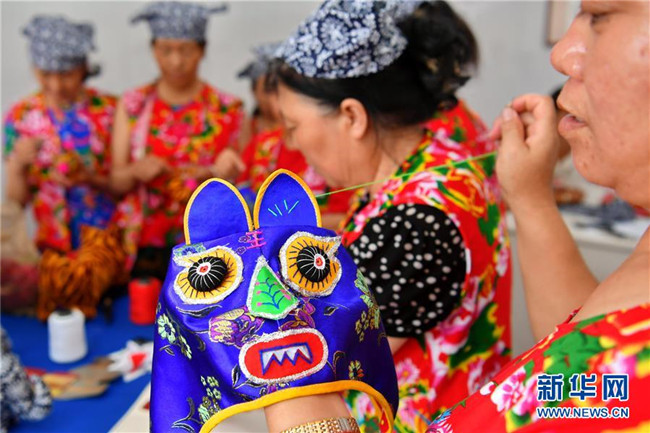 山西省臨縣寨則坪村是呂梁山上典型的貧困村。2017年5月,該村邀請縣里的老手藝人對10余位婦女進行布藝加工的集中培訓,并在村委院子里建起了布藝加工廠??恐庸じ挥挟數靥厣男瑝|、肚兜、布老虎等工藝品,這些婦女每月能拿到1500元的工資,這幫助她們順利摘下了“窮帽子”。新華社記者 曹陽 攝