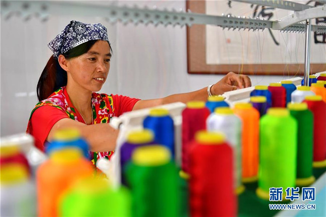 7月18日,臨縣寨則坪村的村民在用機器為布料繡花。