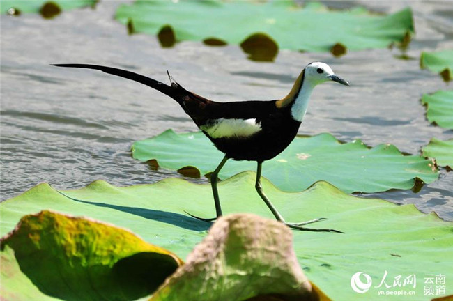 7月19日電近日,云南石屏異龍湖國家濕地公園迎來了最美荷花季,有攝影愛好者在公園內(nèi)拍攝時意外拍到了兩只珍貴長尾水雉現(xiàn)身的照片。