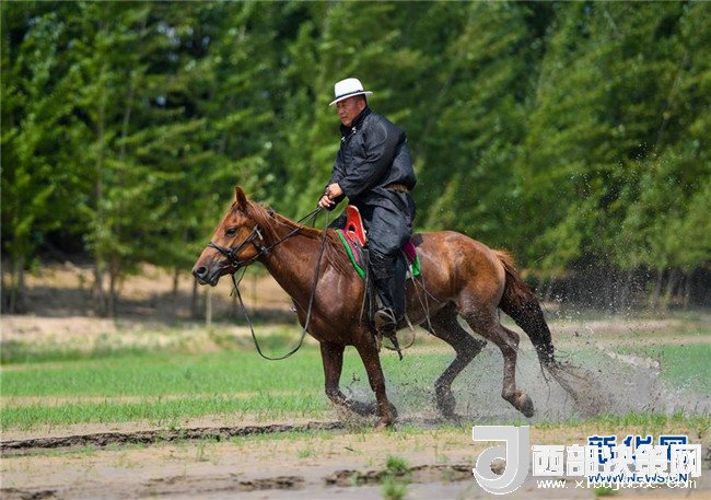 呼日查畢力格騎馬在河中奔跑(7月21日攝)。新華社記者彭源攝