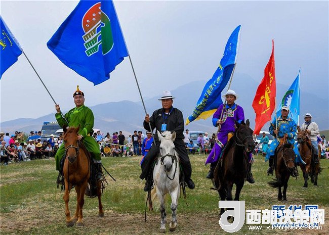 呼日查畢力格(左二)在赤峰市巴林左旗那達(dá)慕上騎馬出場(7月19日攝)。新華社記者彭源攝
