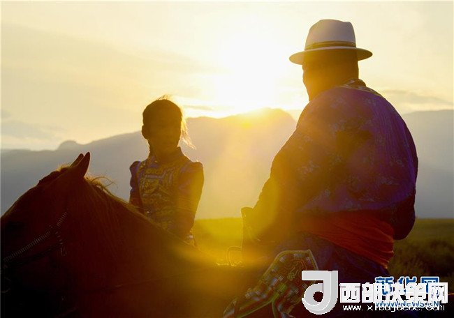 夕陽下,呼日查畢力格在教女兒騎馬(7月20日攝)。新華社記者彭源攝