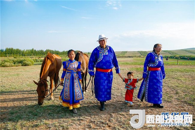 呼日查畢力格(左二)與家人牽馬走在草場上(7月20日攝)。新華社記者彭源攝