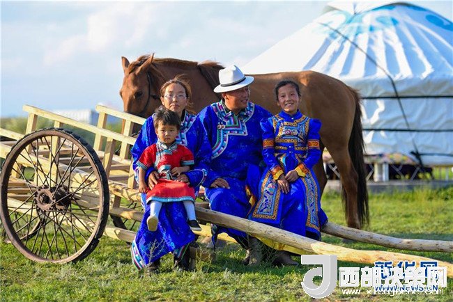 呼日查畢力格(右二)與家人坐在勒勒車前合影(7月20日攝)。新華社記者彭源攝