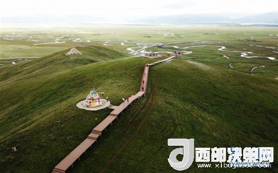 游客在瑪曲縣阿萬倉濕地的觀景步道上游覽(7月31日無人機拍攝)。 新華社記者 陳斌 攝