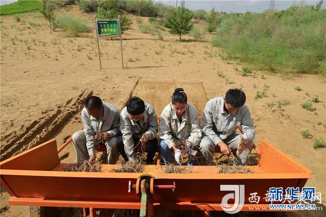技術人員在位于內蒙古鄂爾多斯市杭錦旗的庫布其沙漠示范甘草平移法(7月24日攝)。 新華社發(fā)(盧燁 攝)