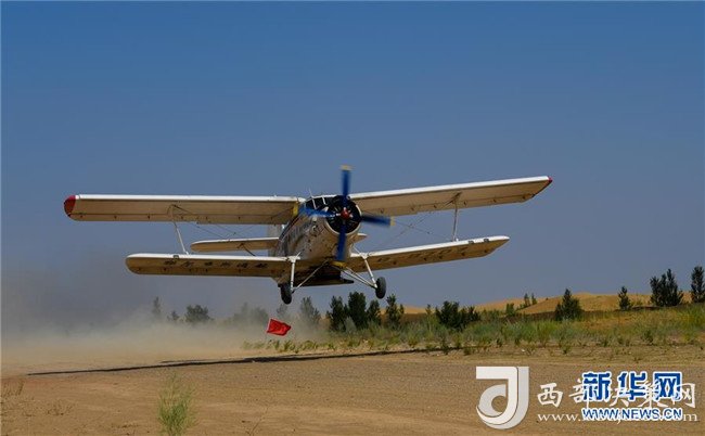 在內蒙古鄂爾多斯市的庫布其沙漠腹地,一架飛播造林用的飛機起飛(7月11日攝)。 新華社記者 彭源 攝