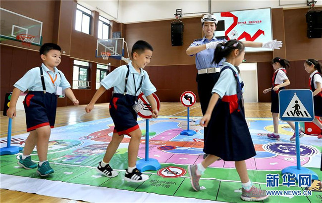 9月3日,小學(xué)生在民警指揮下模擬通過人行橫道。