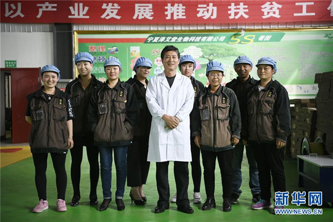 潘文賢(前排中)在寧夏固原市隆德縣隆德人造花工藝有限公司與企業(yè)員工合影(8月29日攝)。來自福建南安市的潘文賢2011年在隆德縣創(chuàng)辦隆德人造花工藝有限公司,成為隆德縣第一家集研發(fā)、生產(chǎn)和銷售于一體的勞動密集型出口創(chuàng)匯企業(yè),產(chǎn)品遠(yuǎn)銷歐美及東南亞等國家和地區(qū)。截至2017年底,已成功打造隆德縣前莊村、紅崖社區(qū)等5個扶貧車間,幫助150人穩(wěn)定就業(yè)、218戶外加工戶靈活增收,帶動300多個建檔立卡戶增收脫貧。新華社記者王鵬攝