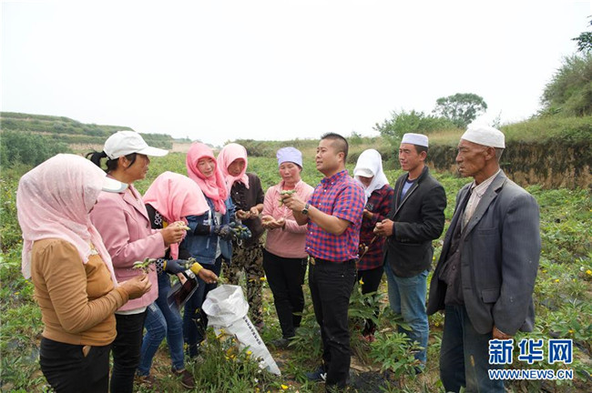 來自福建長樂的林錦云(右四)在固原市河川鄉(xiāng)向農(nóng)戶講解采摘注意事項(8月28日攝)。2014年,林錦云通過土地流轉(zhuǎn)方式,承包了河川鄉(xiāng)1.5萬畝荒山,打造油用牡丹生產(chǎn)基地。目前,林錦云種下的7600畝油用牡丹已經(jīng)開始產(chǎn)生效益,公司已就近吸納村民300多人就業(yè),其中建檔立卡戶39戶,人均年收入2萬多元。 新華社記者姜克紅攝