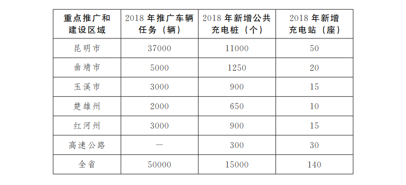 新能源汽車推廣的具體目標(biāo)為:重點(diǎn)圍繞私人購車、政府采購、公共出行、城市物流以及旅游等領(lǐng)域,在昆明市、曲靖市、玉溪市、楚雄州、紅河州等滇中城市群和重點(diǎn)旅游城市及景區(qū),2018年推廣5萬輛新能源汽車。其他州、市不下達(dá)推廣任務(wù),由州、市人民政府結(jié)合實(shí)際積極推廣新能源汽車。