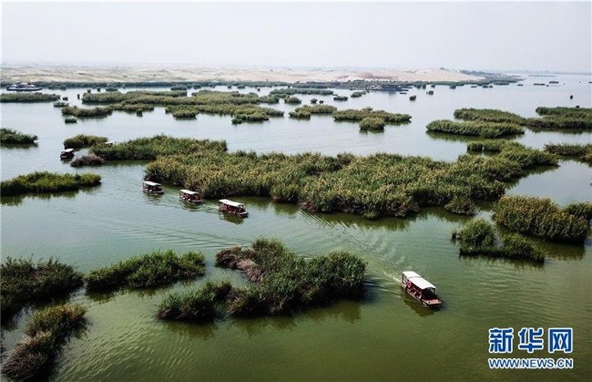 游客乘船在寧夏石嘴山市平羅縣沙湖景區(qū)游玩(9月12日無人機(jī)拍攝)。 寧夏,地處中國西北腹地。這里的大山、大河、草原、沙漠、湖泊,猶如一幅幅美妙畫卷,讓人流連忘返。 新華社記者 陳斌 攝