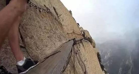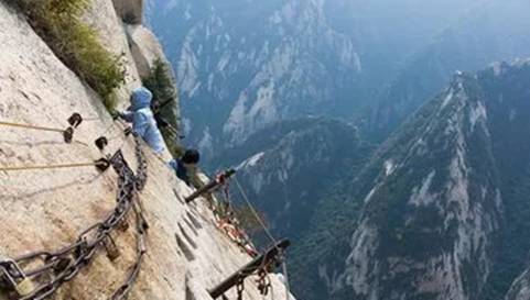 在約2160米高的峭壁上鑿出踏腳之處,鑲嵌石釘搭木椽并用鐵索固定建造的一條懸空棧道,那就是長空棧道。它位于華山極頂南峰東側(cè)南天門外的山腰間,經(jīng)燕子叼表、朝元洞,踩崖隙凌空懸梯下10余華山長空棧道米,沿附懸崖而搭寬不盈尺的方木棧道至全真巖下。