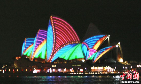 資料圖:澳大利亞的著名標(biāo)志性建筑悉尼歌劇院在燈光的裝飾下,夢(mèng)幻迷人,五彩奪目。中新社發(fā) 沙長(zhǎng)華 攝