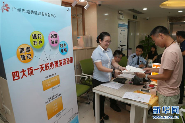 7月19日,“四大項(xiàng)一天聯(lián)辦服務(wù)專(zhuān)窗”在廣州市越秀區(qū)政務(wù)服務(wù)中心亮相,工作人員將營(yíng)業(yè)執(zhí)照遞交給申請(qǐng)者。 新華社記者 張加揚(yáng) 攝