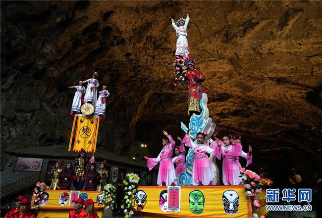 10月14日,表演者在興文石海世界地質(zhì)公園的溶洞內(nèi)表演國家級非物質(zhì)文化遺產(chǎn)“大壩高裝”。