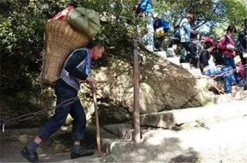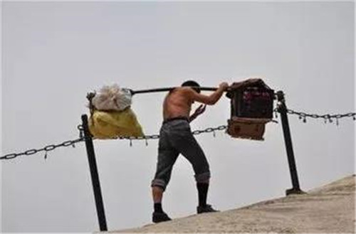 以前爬華山時,碰到的華山挑夫看上去大都三四十歲的樣子,也有年長的,這些人普遍是因?yàn)榧彝ダщy,生活所迫,不得已用肩膀挑起了家里的生活重?fù)?dān)!