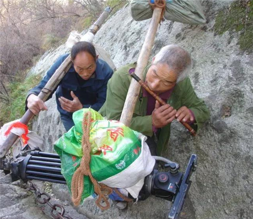 一副扁擔(dān)、一根長繩,或者一個背簍、一根登山用的手杖就是華山挑山工掙錢養(yǎng)家的家伙什。