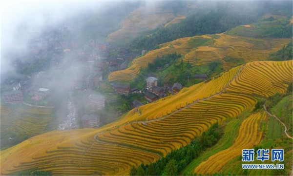 10月16日,游客在秋雨中欣賞龍脊梯田秋色(無人機(jī)拍攝)。金秋時節(jié),廣西龍勝各族自治縣龍脊梯田美如畫卷。 新華社記者 黃孝邦 攝