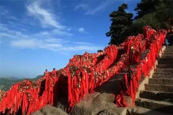 到達金鎖關(guān)時,一番令人動容的風(fēng)景——金鎖關(guān)關(guān)內(nèi)、關(guān)外登山路兩側(cè)的鐵索上,情侶鎖重重疊疊,紅繩彩線迎風(fēng)搖曳,筑成一道美麗的愛情心愿風(fēng)景線。 眼前大片大片的紅色,令游人的視覺和心靈受到強烈的沖擊。這是沿路兩邊鐵鏈上綁滿的密密麻麻的紅色絲繩,不留一絲空隙,風(fēng)吹來,長長的紅色絲繩就輕盈的舞起來,如愛情牢固的臂膀,甜蜜的飛翔在華山之上。