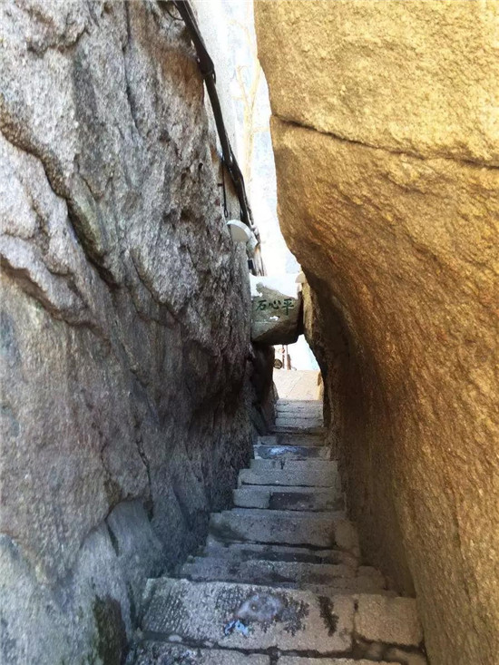 過(guò)千尺幢向北折即到"百尺峽",它是登華山的第二個(gè)險(xiǎn)境。峽的兩壁欲合,卻被飛來(lái)的兩顆石塊從中撐開,人從石頭下鉆過(guò),膽戰(zhàn)心驚,生怕石塊從兩壁間掉下來(lái),這就是"驚心石"。通過(guò)此石懸著的心才放下來(lái),再回頭看原來(lái)此處卡著的兩塊石頭,是上大下小故能安然無(wú)恙,所以這顆石頭也被稱之為"平心石"。故韓愈詩(shī)中有"俄然神功就,殺氣見(jiàn)棱角"的描寫。