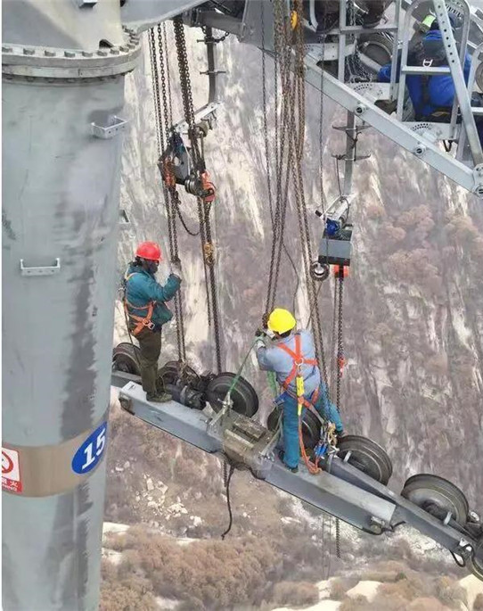 當(dāng)發(fā)現(xiàn)索道支架有異響時(shí),維護(hù)工就要上支架了。從檢修車(chē)車(chē)廂里翻出來(lái)、順著掛在鋼索下的車(chē)臂攀緣上去,越過(guò)鋼絲繩,跨上支架,維護(hù)工開(kāi)始工作。最高的支架65米,站在高聳入云的支架上,有一種站在懸崖邊的感覺(jué)。