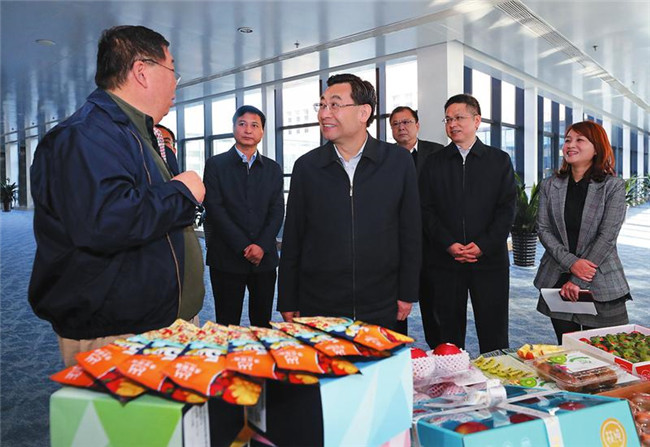 10月31日,省委書(shū)記胡和平深入西安市部分民營(yíng)企業(yè)調(diào)研。圖為他在海升集團(tuán)果業(yè)總部聽(tīng)取產(chǎn)品種類、產(chǎn)業(yè)扶貧等情況介紹。 記者 宋紅梅攝