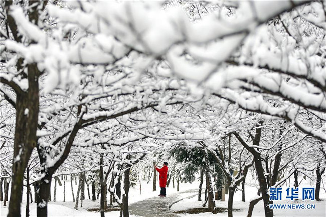 當日,甘肅省平?jīng)鍪谐霈F(xiàn)降雪天氣,銀裝素裹的冰雪世界吸引市民前來欣賞雪景。新華社發(fā)(吳希會 攝)