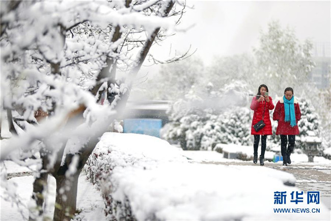 11月5日,市民漫步在雪花飛舞的平?jīng)鍪嗅轻紖^(qū)南山生態(tài)公園內(nèi)。
