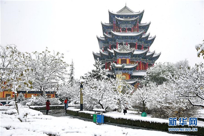 當日,甘肅省平?jīng)鍪谐霈F(xiàn)降雪天氣,銀裝素裹的冰雪世界吸引市民前來欣賞雪景。新華社發(fā)(楊昕 攝)