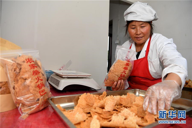 11月22日,姚新花在鍋巴廠里包裝鍋巴。  新華社記者 徐亮攝