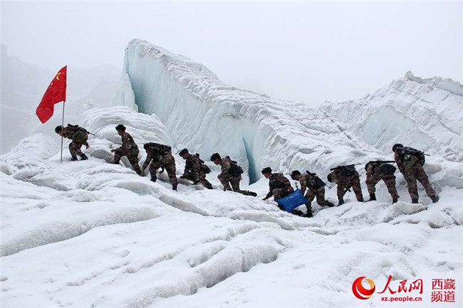 模范營官兵在海拔6200多米的某冰川巡邏。羅凱 攝模范營官兵在海拔6200多米的某冰川巡邏。羅凱 攝