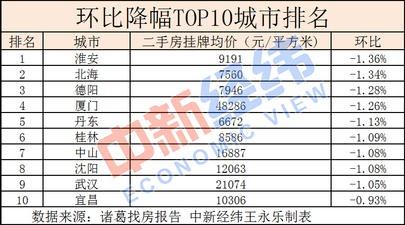 數(shù)據(jù)顯示,淮安(-1.36%)、北海(-1.34%)、德陽(-1.28%)、廈門(-1.26%)、丹東(-1.13%)、桂林(-1.09%)、中山(-1.08%)、沈陽(-1.08%)、武漢(-1.05%)、宜昌(-0.93%)為環(huán)比跌幅TOP10城市。
