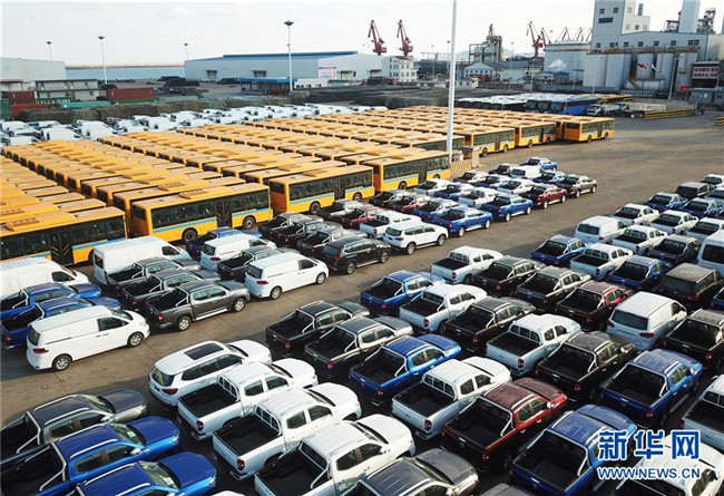 大批國產車輛在江蘇連云港港口碼頭等待裝船(2018年12月31日無人機拍攝)。新華社發(fā)(耿玉和 攝)