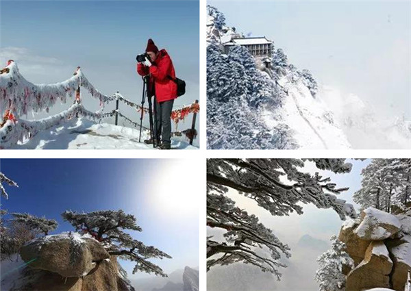 華山在11月進入冬季,12月至次年3月全山飄雪,而2月前為最旺雪期。游客可欣賞到難得一見的華山雪景——美麗的霧凇給樹木、巖石、屋舍都披上一層晶瑩的薄衣,尤其在大雪覆蓋后,山景變成一幅曼妙的白色圖畫,峰上的樹木和古藤被透明的冰層包裹,極富魅力。