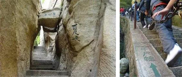 千尺幢,是經華山峪登主峰的必經之道。這里原為一崖間裂隙,直立70度,后來人們沿隙鑿拓成路,有石階370級,階寬僅容半足,游人登臨時,仰視一線天,俯視若臨深井。百尺峽在“千尺幢上,也是巖隙險道,有石階91級,游人須挽索而上。有詩云:“幢去峽復來,天險不可瞬,雖云百尺峽,一尺一千仞”。