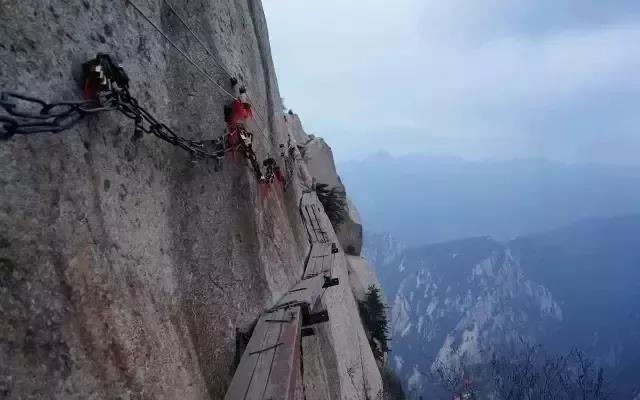 長空棧道:長空棧道位于華山南峰東側(cè)山腰,是華山派第一代宗師元代高道賀志真為遠(yuǎn)離塵世靜修成仙,在萬仞絕壁上鑲嵌石釘搭木椽而筑。棧道上下皆是懸崖絕壁,鐵索橫懸,由條石搭成尺許路面,下由石柱固定,游人至此,面壁貼腹,屏氣挪步,被喻為“華山第一天險”。