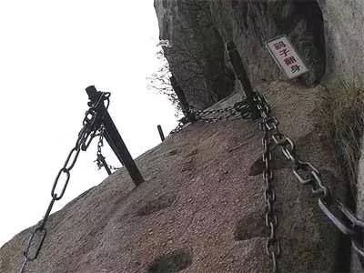 鷂子翻身:在華山東峰,是通往下棋亭的必由之路,為華山著名的險道之一。其路鑿于倒坎懸崖上,下視唯見寒索垂于凌空,不見路徑。游人至此,須面壁挽索,以腳尖探尋石窩,交替而下,其中幾步須如鷹鷂一般、左右翻轉(zhuǎn)身體才可通過,故名鷂子翻身。