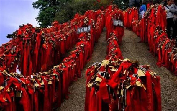 金鎖關——登山路兩側鐵索上情侶鎖,重重疊疊,紅繩彩線迎風搖曳,在這里,鎖住你們對愛情的誓言,表達隊愛情忠貞!