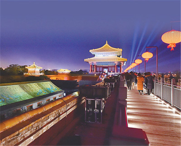觀眾入場(chǎng)前,可觀賞午門城樓及東、西雁翅樓在燈光映照下的壯美雄姿。自午門入場(chǎng)后,首先觀賞點(diǎn)亮后的太和門廣場(chǎng),隨后由午門西馬道登午門城樓,參觀“紫禁城里過大年”展覽,在東雁翅樓欣賞中央民族樂團(tuán)琵琶演奏家趙聰及其團(tuán)隊(duì)的演奏。結(jié)束午門展廳參觀后,觀眾沿著由紅燈籠點(diǎn)綴的城墻步行至東南角樓,觀看虛擬現(xiàn)實(shí)影片《角樓》,隨后來到東華門城樓,參觀“營(yíng)造之道——紫禁城建筑藝術(shù)展”。當(dāng)走過近千米長(zhǎng)的布滿紅燈籠的故宮東城墻時(shí),可以看到臨近城墻西側(cè)的部分古建筑也被點(diǎn)亮,聆聽暢音閣戲樓傳來的戲曲聲。到達(dá)東北角樓后,觀眾步行至神武門,在這一區(qū)域可以觀賞到城墻南北兩側(cè)通過藝術(shù)燈光投影于建筑屋頂上的《千里江山圖》等作品,從而產(chǎn)生人在畫中游的感覺。離開神武門城樓后,神武門外東、西兩側(cè)的角樓餐廳和角樓咖啡靜候光臨,從而結(jié)束此次“上元之夜”文化活動(dòng)。