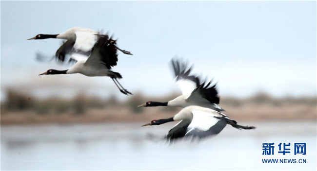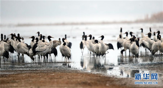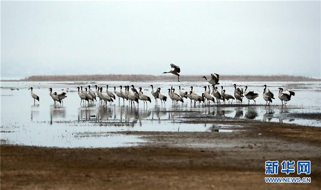 2月21日在草海國家級自然保護區(qū)內(nèi)拍攝的黑頸鶴。新華社發(fā)(韓賢普攝)