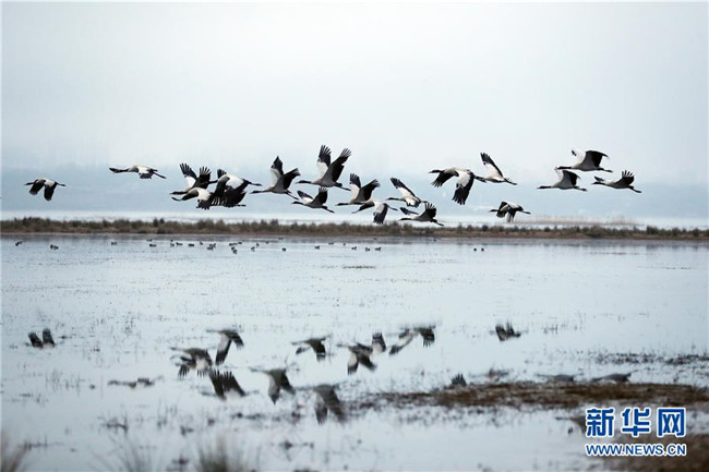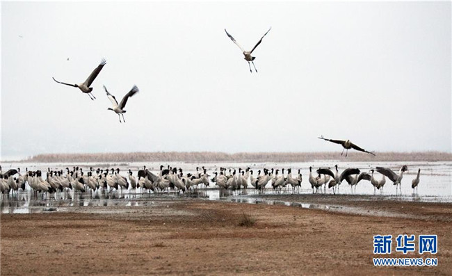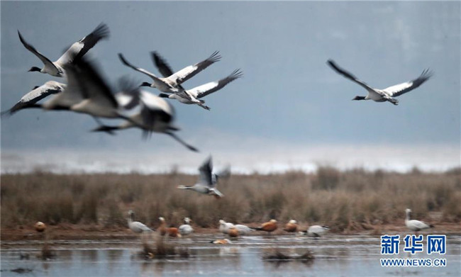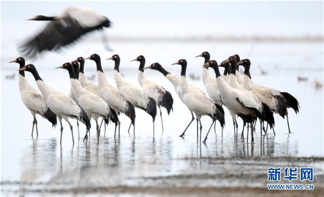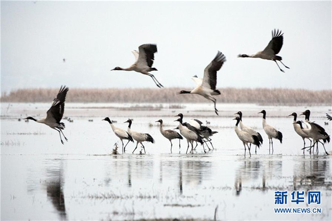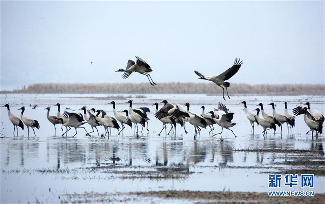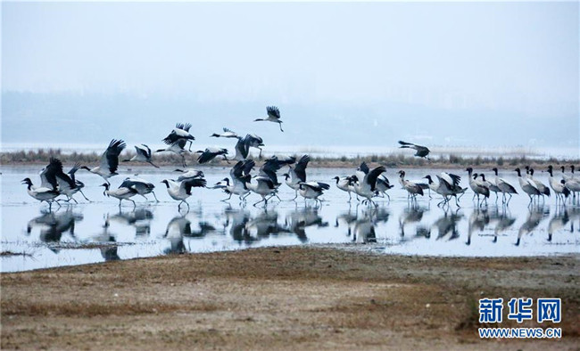 當日,貴州省威寧彝族回族苗族自治縣草海國家級自然保護區(qū)內(nèi),黑頸鶴翩躚起舞、姿態(tài)萬千。