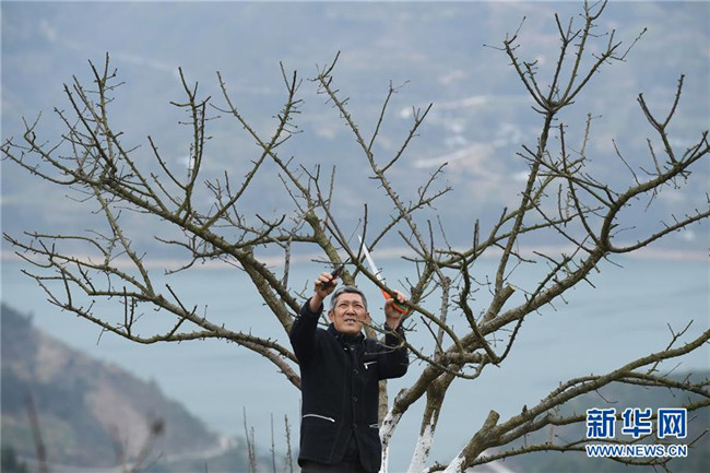 重慶市巫山縣曲尺鄉(xiāng)朝陽(yáng)村村民在脆李種植地里對(duì)脆李樹進(jìn)行管護(hù)(2019年2月16日攝)。新華社記者王全超攝
