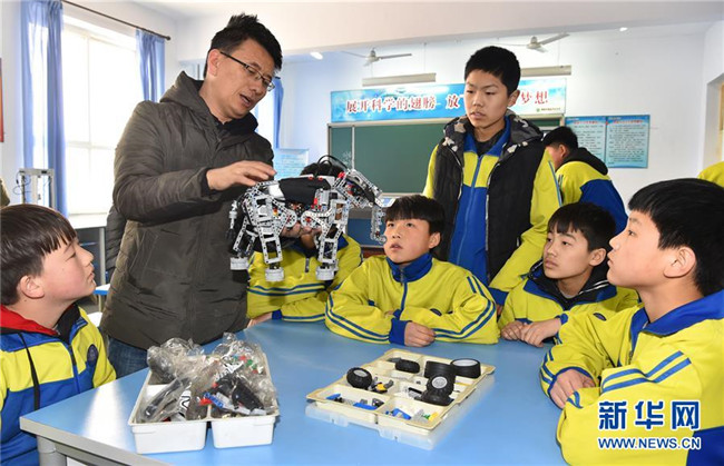 2月28日,在石家莊市藁城區(qū)韓家洼中學(xué),教師為學(xué)生講解“機(jī)器人”組裝技巧。  新華社發(fā)(張曉峰 攝)